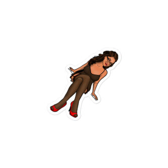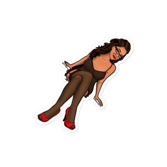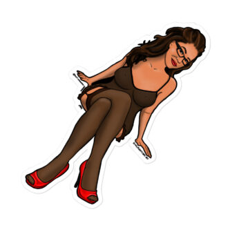 The Hillside Sweety sticker features an illustrated character of a woman sitting in a playful, confident pose. She has long, wavy brown hair and is wearing glasses, which add a stylish, intellectual vibe. Her outfit consists of a black, sheer lingerie dress paired with black stockings and bright red high heels. The combination of her crossed legs, slight smile, and relaxed posture exudes a mix of charm and sensuality. The overall design has a cartoon-like quality, with bold outlines and smooth shading, making it a vibrant and eye-catching graphic.